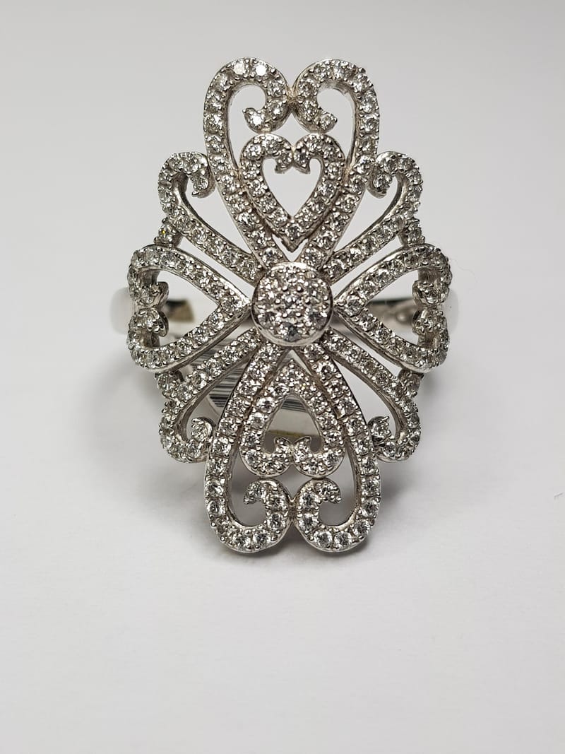 18ct White Gold and Diamond ring with cluster set in the centre, multiple small and large hearts filigree style. 183 x rbc with TDW .82ct G/SI