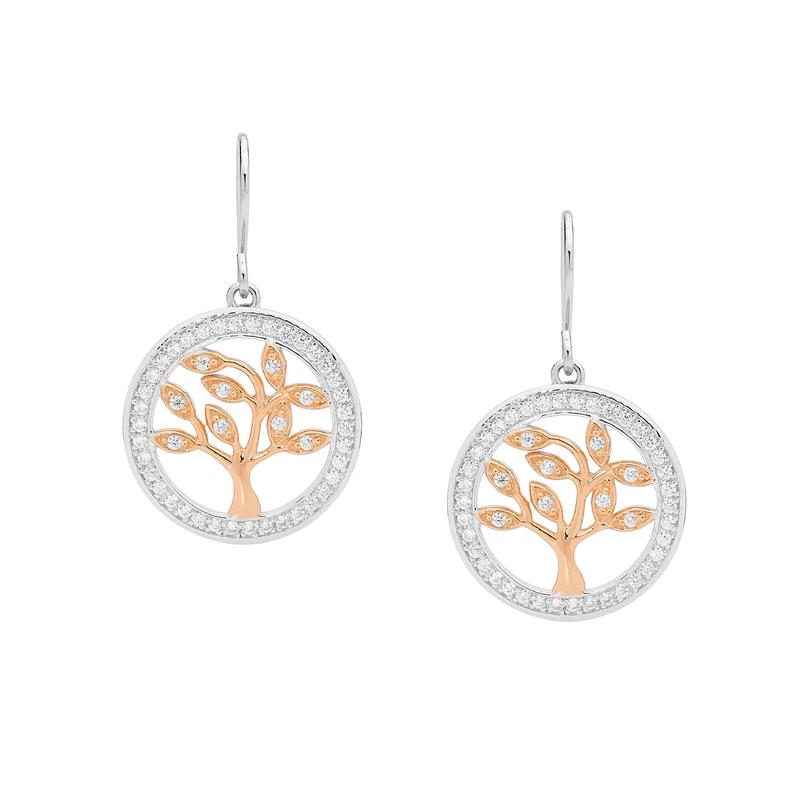 Rose and Sterling silver tree of life earrings set with white stones with rhodium protection.