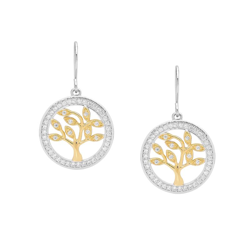 2 tone sterling silver tree of life earrings set with white stones protected by rhodium.