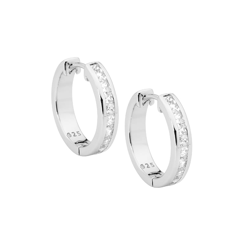 Sterling silver channel set huggies with white stones and protected by rhodium.